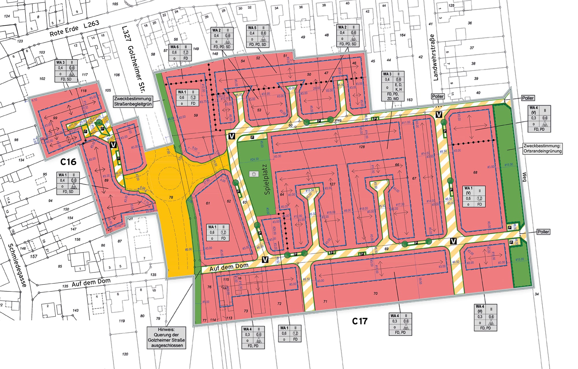 Im Bebauungsplan (C16 und C17) (B-Plan) legt die Gemeinde als Satzung fest, welche bauliche Nutzung auf einer Fläche zulässig ist. In der Regel besteht der Bebauungsplan aus einer Planzeichnung (Teil A) und einem Textteil (Teil B). Für die Hausplanung sind diese Vorgaben sowie eine eventuelle Gestaltungssatzung zu beachten.