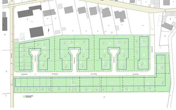 In dem vorliegenden Bestandsplan markieren die grün schraffierten Flächen die bereits verkauften Grundstücke.