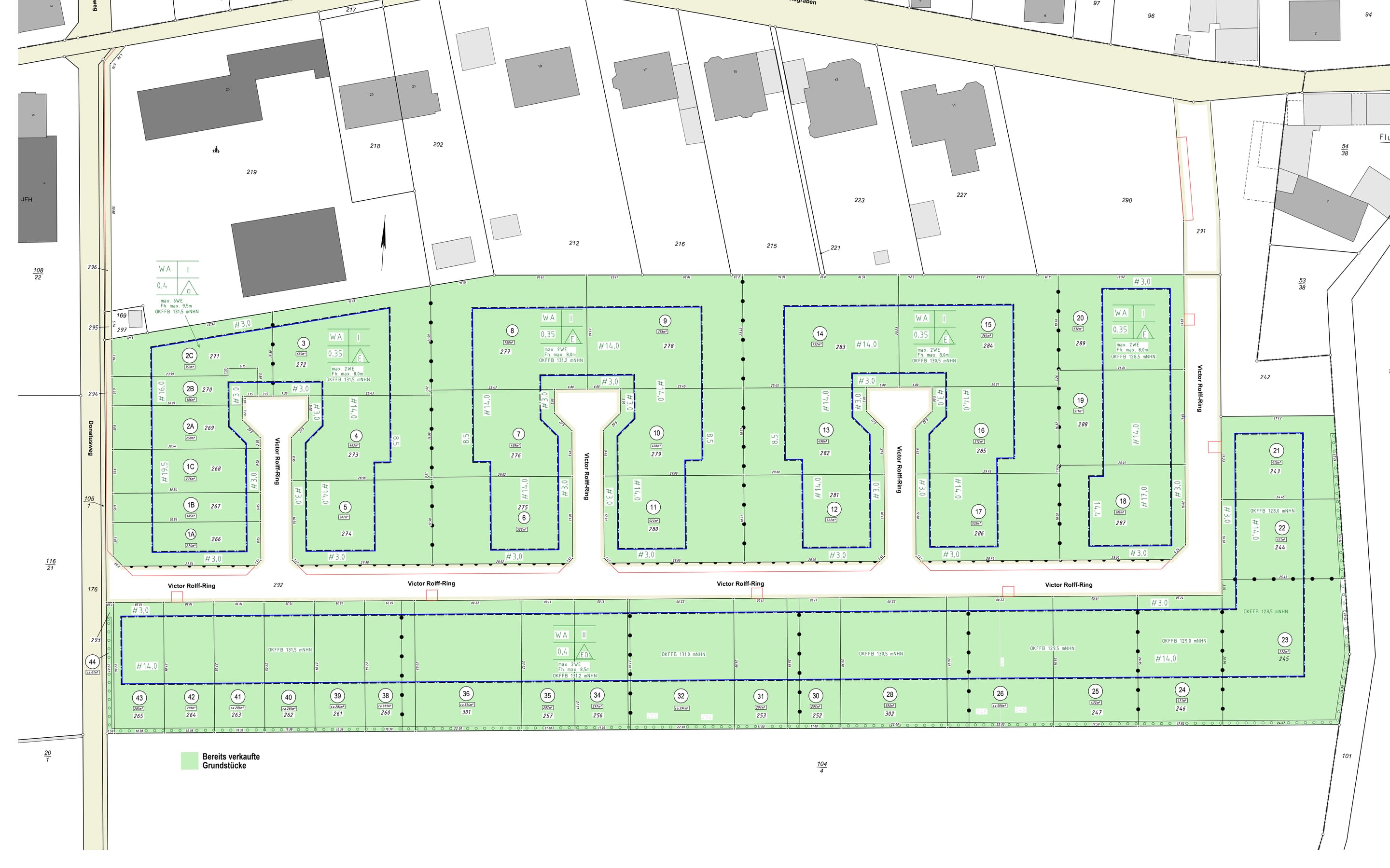 Generell befindet sich auf jeder Parzelle eine Nummerierung, die Größe des Grundstücks, die Breite der Straßenfront und der Grundstückspreis inkl. Erschließung.