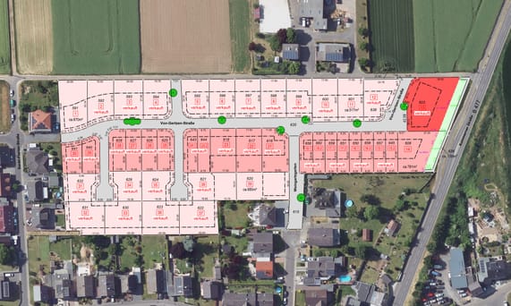 Generell befindet sich auf jeder Parzelle eine Nummerierung, die Größe des Grundstücks, die Breite der Straßenfront und der Grundstückspreis inkl. Erschließung.