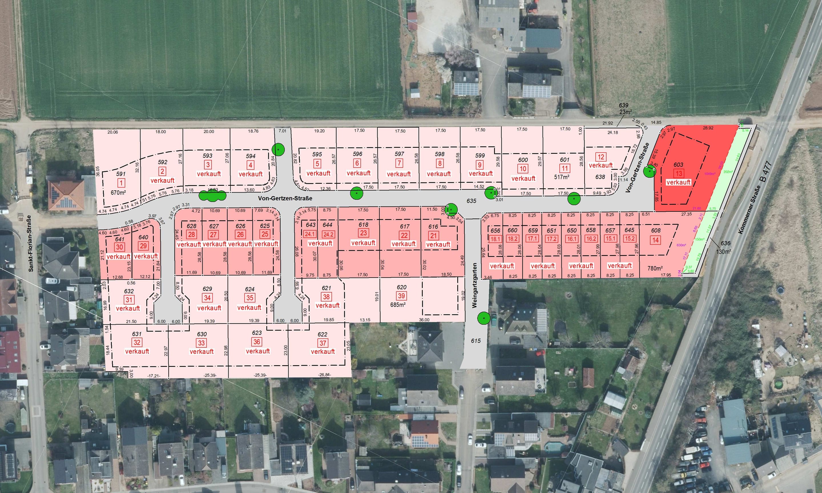 In dem vorliegenden Bestandsplan markieren die grün schraffierten Flächen die bereits verkauften Grundstücke.